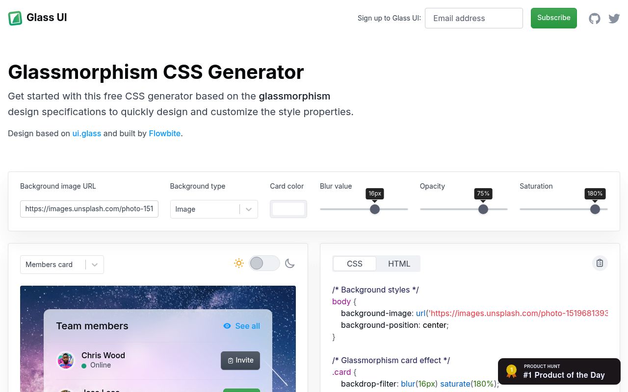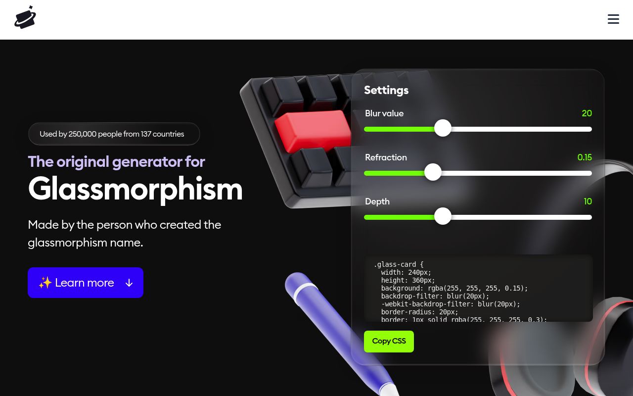 An incredible online tool for generating quick glassmorphic UI in CSS code snippets.