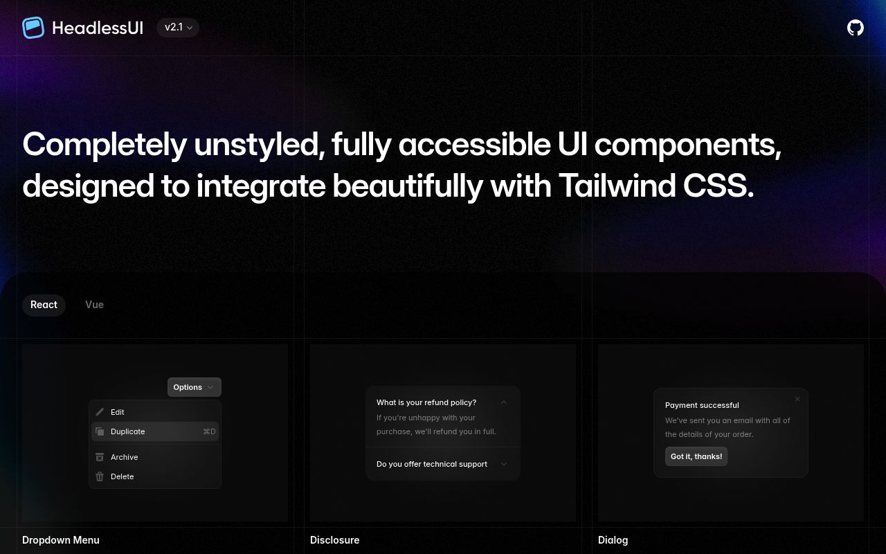 Completely unstyled, fully accessible UI components, designed to integrate beautifully with Tailwind CSS.